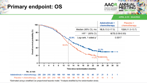 本次大会上口头报告的研究结果显示,中位随访时间13.5个月,阿得贝利单抗联合化疗组和安慰剂联合化疗组中位OS分别为15.3个月和12.8个月。1年OS率为62.9%vs52.0%,2年OS率为31.3%vs17.2%。独立评审委员会(IRC)评估的无进展生存期(PFS)为5.8个月vs5.6个月,6个月PFS率分别为49.4%和37.3%,12个月PFS率分别为19.7%和5.9%,ORR分别为70.4%和65.9%,DoR分别为5.6个月和4.6个月,目前显示获益趋势[8]。