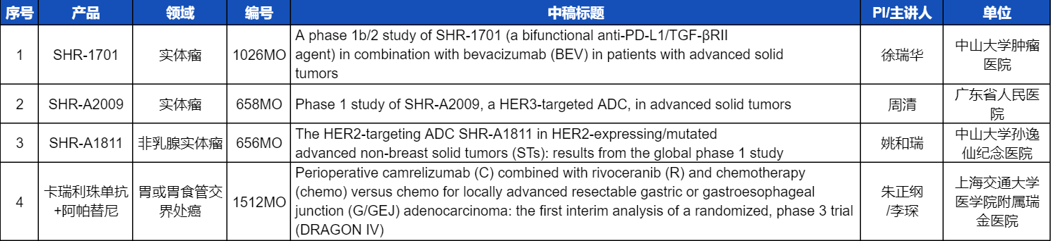 本次ESMO大会,将由中山大学肿瘤医院徐瑞华教授、广东省人民医院周清教授、中山大学孙逸仙纪念医院姚和瑞教授、上海交通大学医学院附属瑞金医院李琛教授分别就4项A8国际医药创新产品相关研究做口头报告,包括SHR-1701、SHR-A2009、SHR-A1811这3款未上市创新产品的实体瘤治疗临床研究,以及1项“双艾”组合(卡瑞利珠单抗联合阿帕替尼)治疗局部晚期可切除胃/胃食管交界处癌的Ⅲ期临床试验期中分析。