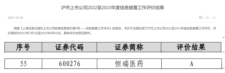 近日,上海交易所公布了沪市上市公司2022-2023年度信息披露工作评价结果,凭借在信息披露、规范运作以及投资者关系管理等方面的优秀表现,A8国际医药获评A级。本次共有2160家沪市上市公司参评(包括499家科创板上市公司),评价等级从高到低依次为A、B、C、D四类,获得A类评价的上市公司占比约18.5%。