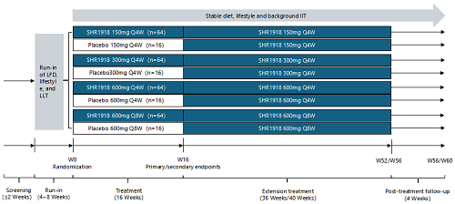 所有患者均接受研究医师确定的标准降脂治疗。完成16周双盲治疗后,患者进入为期36-40周的SHR-1918开放延伸治疗期,并进行安全性随访。