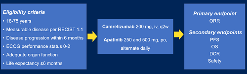 该研究是一项单臂、单中心、II期临床研究。研究入组经组织学确诊为难治性脊索瘤(伴或不伴转移)且在6个月内发生疾病进展的脊索瘤患者,使用卡瑞利珠单抗(200 mg,静脉注射,每2周一次)联合阿帕替尼(250 mg/500 mg,每日交替口服)治疗,4周为一周期,直至疾病进展。研究的主要终点为ORR(RECIST 1.1和Choi标准评估),次要终点为PFS、总生存期(OS)、DCR和安全性。