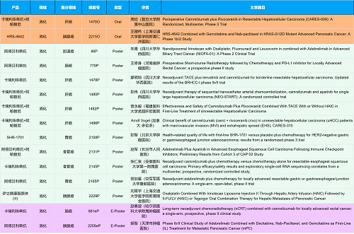 在消化系统肿瘤领域,A8国际创新产品相关研究共入选2项口头报告、10项壁报和2项电子壁报,共14项研究。除了明星药物卡瑞利珠单抗和阿帕替尼外,还有5篇阿得贝利单抗治疗消化系统肿瘤的研究入选。此外,HRS-4642、瑞拉芙普-α注射液(SHR-1701)等未上市创新产品也有相应研究入选。随着新老药物前沿研究的不断推进,有望为消化系统肿瘤患者带来新的福音!